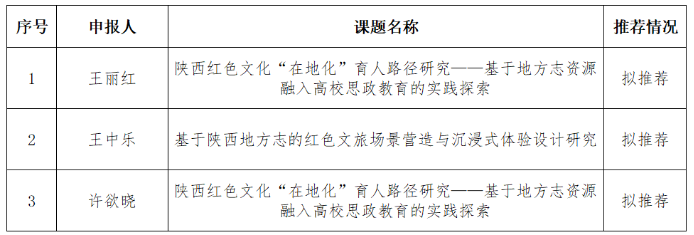 根据《关于陕西省哲学社会科学研究专项2026年度红色文化重大课题研究项目申报的通知》(陕社科联〔2026〕28号)文件,学校根据公平、公正、公开的原则经专家评审,拟推荐项目3项。现将有关信息进行网上公示,接受监督。